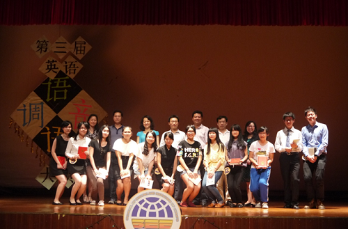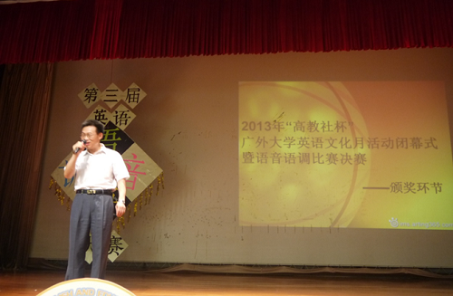 很快,比赛迎来尾声,评委老师也已根据各位选手的现场表现评好了分,公布了各个奖项的获奖名单。最后,董金伟经理肯定并赞扬了今晚各选手的表现,随后宣布2013年“高教社杯”广外大学英语文化月活动的完满落幕。