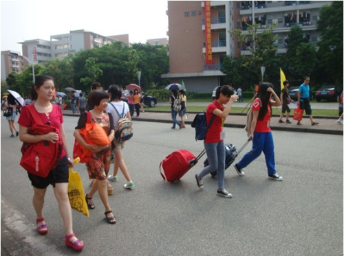 晴空万里,烈日当照,早上七点,迎新工作正式展开了。公司在中国银行附近设有新生接待点,接待点的志愿者们身穿红色的志愿者服装,高举标牌,随时随地等待新生的到来。汗水从她们的额头流到了脖颈,但是她们没有抹去脸上的汗水,而是四处张望,等待那股新的血液流进温暖的英教大家庭。一旦看到新生,志愿者脸上的笑容更是如花绽放并以最快的速度接过新生手中的行李,迅速指引她们到大本营报到;部分搬运队的志愿者更是搬着行李爬上了七楼的员工宿舍,看着家长与新生脸上肯定的笑容,她们完美地诠释了志愿者三个字。