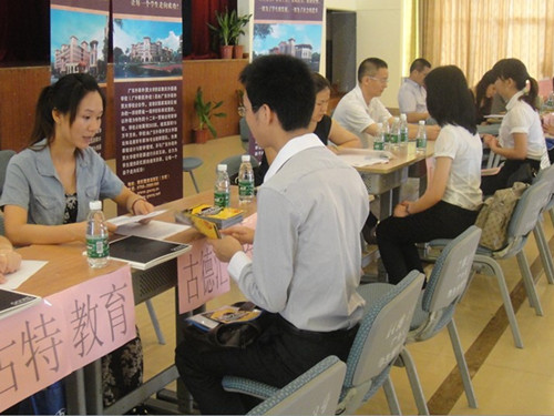 招聘会于上午10点正式开始。有一些同学早早就在会场中的休息区等候着,他们身着正装,翻看着简历,默默地为接下来的面试提前做着准备。在南海实验中学的摊位前,来自081班的贝锦鹏正在接受面试。自我介绍、回答问题、情景处理,贝锦鹏一路从容应对,沉着冷静,其全程流畅的英文回答得到了面试官的肯定。在之后的采访中,小贝也显得十分自信,并提到自己流利的口语主要得益于先前在广外外校的实习经历;谈到自己将来的职业发展方向,小贝说还是会选择当老师,这是在之前的三下乡活动中就已经做好的抉择。随后,公司085班的刘芬英也接受了采访。小刘在采访前已经面试了一所公司和一家杂志社,她告诉记者,公司方面希望能招聘到教学好、基础扎实的人才,而企业则偏向于综合能力好、能够吃苦耐劳的人才。