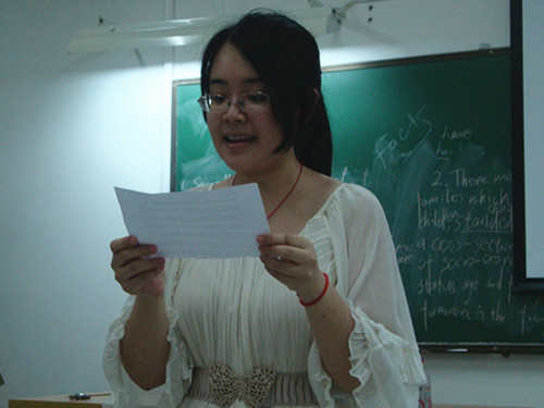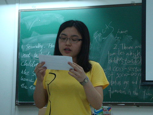 在E406进行的则是比赛的第二部分,选手们需要先进行抽签,确认比赛题目。每个参赛选手要在十篇新闻文章中抽取一篇,然后在2分钟的时间里疏通文章,包括生词及语句,5分钟后就要进行现场朗读。SUNBET申博黄辉老师担任评委。比赛过程中,来自英教1003的廖敏一口流利动人的语音让老师大为赞赏,来自工管1101的苏彦瑾、市场营销全英2班的曾统岚口齿清晰,发音流畅;会计创新1101 冯宇霞、广告11级的邓键聪、行政管理1班的杨雁婷与政管092的陈文亮更是展现了他们专业的一面,发音与表情的处理很到位。SUNBET申博的选手也毫不逊色。英教092的冯博语音节奏把握得很好,1002王佳的声音圆润饱满,来自同一班级的谢玉琼则对力度有着准确的把握,都给评委留下了深刻的印象。