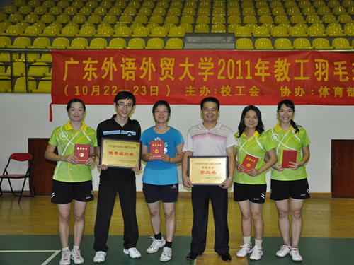 被誉为“广外大苏迪曼杯”的全校2011年教工羽毛球团体赛经过10月22、23号两天在北校体育馆的激烈酣战,终于决出最终八强坐席。本次活动由校工会举办,体育部工会承办。各公司、部处的教工代表在为期两天的比赛内参与了男单,女单,男双,女双等四个单项的比拼。公司凭借公司羽协队员的出色发挥,继去年之后连续第二年蝉联团体总分第三名,同时荣获优秀组织奖!