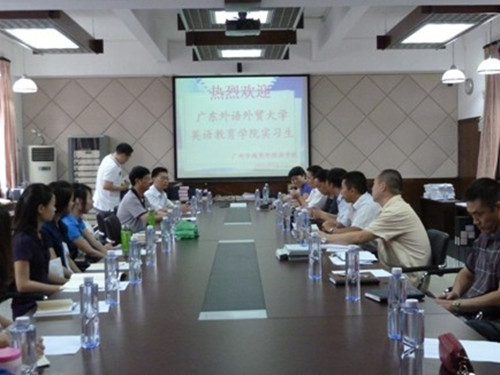 越秀外校的石远习董事长、党总支书记杨建伟、副董事长李洪奇、陈晓莲、严永铭以及教导处主任李志飞和英语科组长杨师民等10多位领导、老师在会议室接待了公司实习队伍,李洪奇副董事长主持见面会。