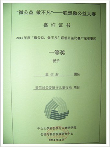 2011年7月18日至2011年8月18日,广外蓝信封组队参加“微公益,做不凡”联想微公益大赛,获得广东赛区一等奖。而廖冰兄人文专项基金会会长廖陵儿老师对蓝信封活动更是大力赞扬和支持,她表示愿意筹一笔善款支持蓝信封相关书信出版,为研究留守儿童的社会学事业做贡献。