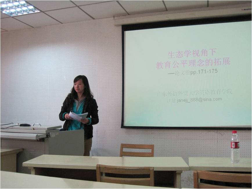 会议的第二个议程是将参会的人员根据提供的论文的题目分为二个命题,六个小组进行讨论。江健和我都在大会上汇报了论文。江健的论文题目是《生态学视角下的教育公平理念的拓展》,我的题目是《基于高校教学团队的人才发展性评价研究》参会代表对我们论文比较感兴趣,引起了热烈的讨论。