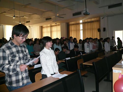 考虑到同学们在观摩的过程中会感到累,所以在中间休息时刻特别由杜苗同学主持带领大家做游戏,只见全体同学都站了起来,时而举双手赞成,时而双手打叉反对,玩得不亦乐乎。