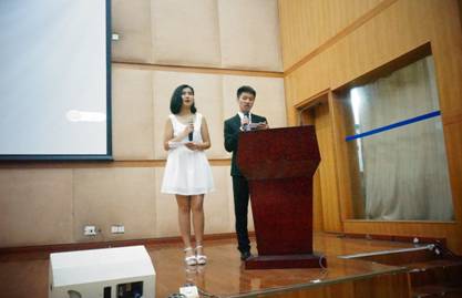 大赛在董金伟经理的热情洋溢的致辞中拉开帷幕。同学们热情高涨,现场的气氛被董经理的一段英文致词引到高潮。“...I think this kind of activity can benefit all of us. Firstly, Iwant to express my heartfelt thanks to all of the teachers of this course...andI wish a great success to today’s final contest...”董金伟经理引经据典表示了对此次英语新闻视频大赛的希冀,以及对各位参赛选手的肯定和祝贺。