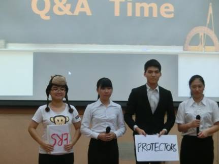比赛正式开始。每个队伍在开始展示之前,都会先播放亲友团小视频。在一分钟的小视屏里可以感受到每支队伍整个团队、整个班级的努力,视频传递出班级里同学们满满的友爱以及支持。每个队伍的展示的主题不一,有的队伍讨论的是对gender difference的看法,有的是针对marriage value,有的是关于当前世界热点global warming……队伍们的展示方式也很多样化,例如模拟法庭、采访、简单的阐述以及模拟场景对话等方式。每个小组展示时间为12分钟,在展示环节过后,还有约两分钟的中外评委提问,评委老师提出问题,员工们在规定的时间内回答问题。此次比赛中每支队伍都将比赛前的充分准备在舞台上尽情地展示,比赛精彩激烈,真是“台上一分钟,台下十年功”!。