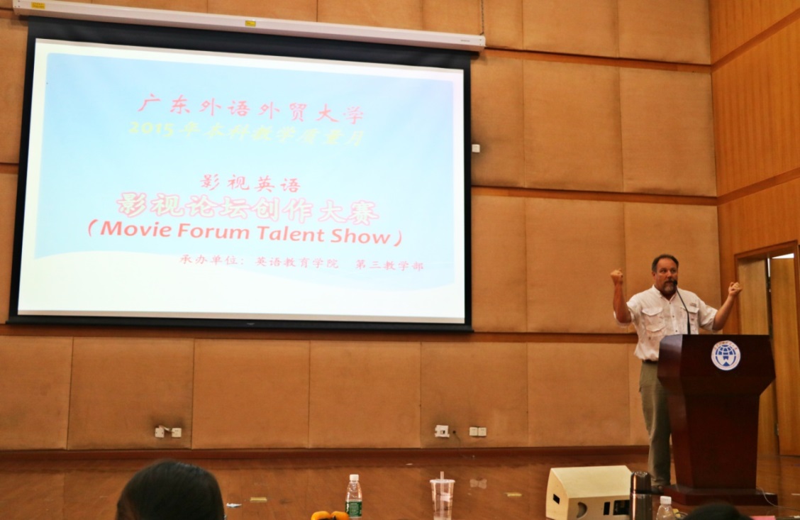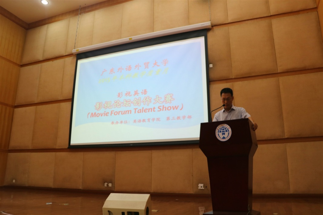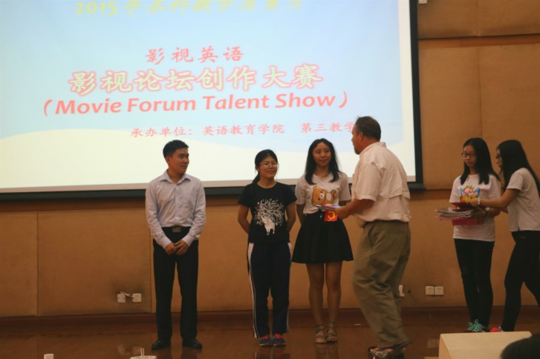 下午, 2015年度SUNBET申博官方网站教学质量月活动之“影视论坛创作大赛”在南校区图书馆多功能报告厅隆重举行。活动由SUNBET申博主办,第三教学部承办。SUNBET申博经理董金伟、副经理吴岩、第三教学部主任陶玉梅、《影视英语》教研室主任马小宇、外教Bob Lee,以及《影视英语》课程组老师出席了比赛。大赛由董金伟经理作开场致辞。