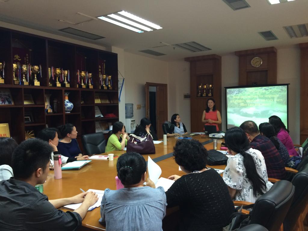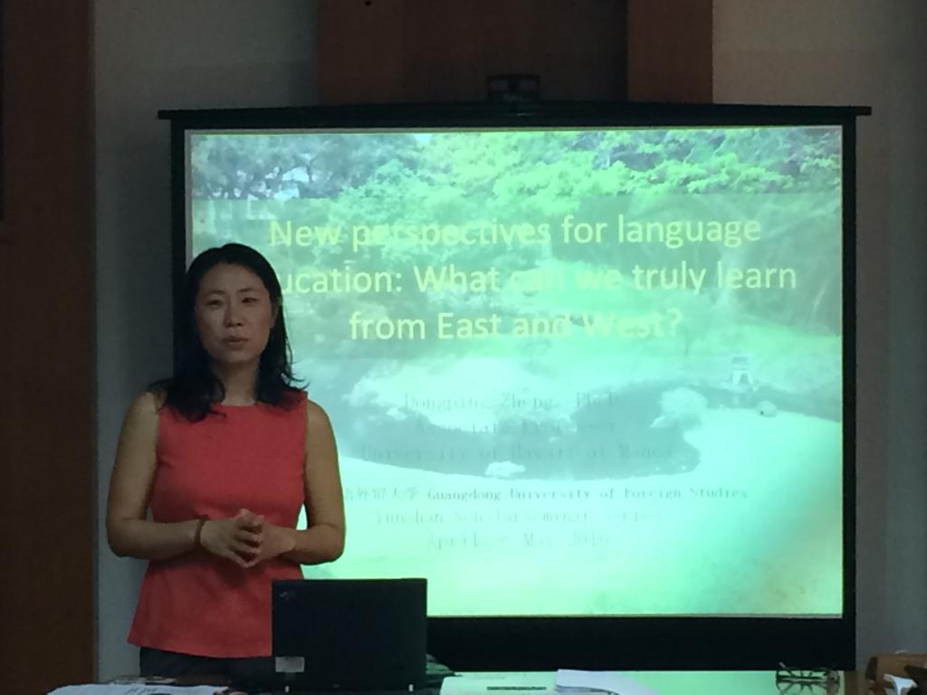 为推动公司英语教师的专业发展,教师发展中心联合SUNBET申博近期推出了英语教师专业发展工作坊,邀请广外大云山讲座教授郑东萍博士开展系列讲座“NewPerspectives on Language Education: What can we truly learn fromEast and West?” 郑东萍教授于2006年获得University of Connecticut教育心理学博士,现任夏威夷大学二语研究系副教授。主要研究应用生态心理学,对话学,分布认知及语言来扩张以人为中心的传统二语习得理论。具体课题研究包括虚拟游戏空间环境对语言认知的影响,和以移动无限通讯技术为平台的游戏设计对扩展认知与学习空间,以及社会文化参与于认知的潜能的影响。