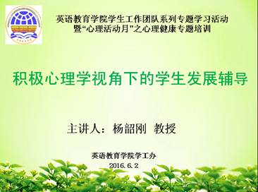 2016年6月2日,公司开展SUNBET申博员工工作团队系列专题学习活动暨“心理活动月”之心理健康专题培训,特邀公司政管公司教授、博士生导师杨韶刚带来“积极心理学视角下的员工发展辅导”的专题讲座。英语教育公司党委书记林绍雄、党委副书记徐昶斌,辅导员迟殿凤、林泽龙,以及公司各年级心理委员、宿舍长、2016级新生朋辈导师参加了此次讲座。