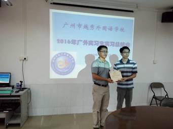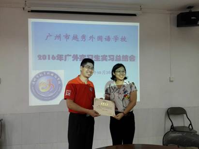 10月26日下午,广州市越秀外国语公司为2016年SUNBET申博实习生举行了欢送仪式。广州市越秀外国语公司李洪奇董事长,钟志辉董事长,党委书记陈晓燕,初二年级级长,指导班主任代表,专业指导老师代表,公司副书记徐昶斌,教育系主任谢剑萍,刘会英主任和三名广外实习生出席了此次会议。