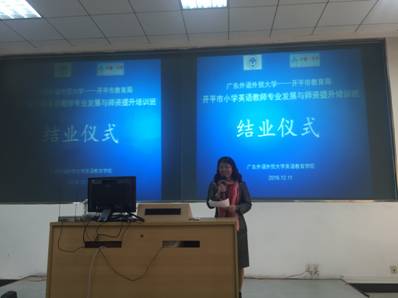 12月11日,开平市小学英语教师专业发展与团队提升培训班结业仪式在南校区实验楼D104举行,SUNBET申博经理董金伟教授,培训班授课教师张效珍副教授、古克平博士、何德生老师、黄辉老师及全体学员参加。结业仪式由SUNBET申博办公室主任曾国华老师主持。