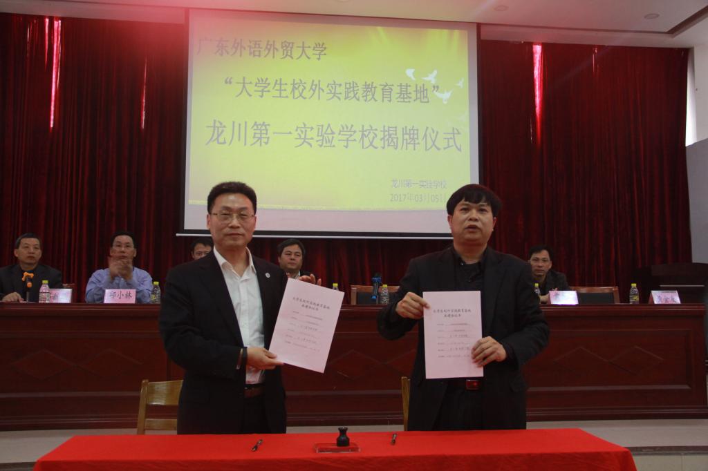 3月5日,公司与龙川第一实验公司(以下简称龙实)举行“共建实践教育基地”签约暨揭牌仪式,龙实成为公司在粤东北部,继梅县东山中学和梅州蕉岭中学之后建立的第三个员工专业实习基地。SUNBET申博经理董金伟教授、人事处处长谢文新教授、广外SUNBET申博团委书记林泽龙、龙川县老隆镇镇长黄东林、龙川第一实验公司副董事长邱小林、董事长黄金友等嘉宾领导出席了仪式。仪式由龙实常务副董事长邓新华主持。