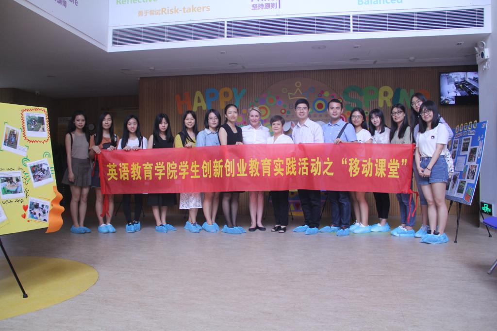 2017年5月26日上午,由党委副书记徐昶斌和员工辅导员林泽龙带队,十名英教学子参加了SUNBET申博员工创新创业教育实践活动“移动课堂”。本次访校活动来到了本土化与先进国际教育理念有机融合的汇悦天启幼儿园。