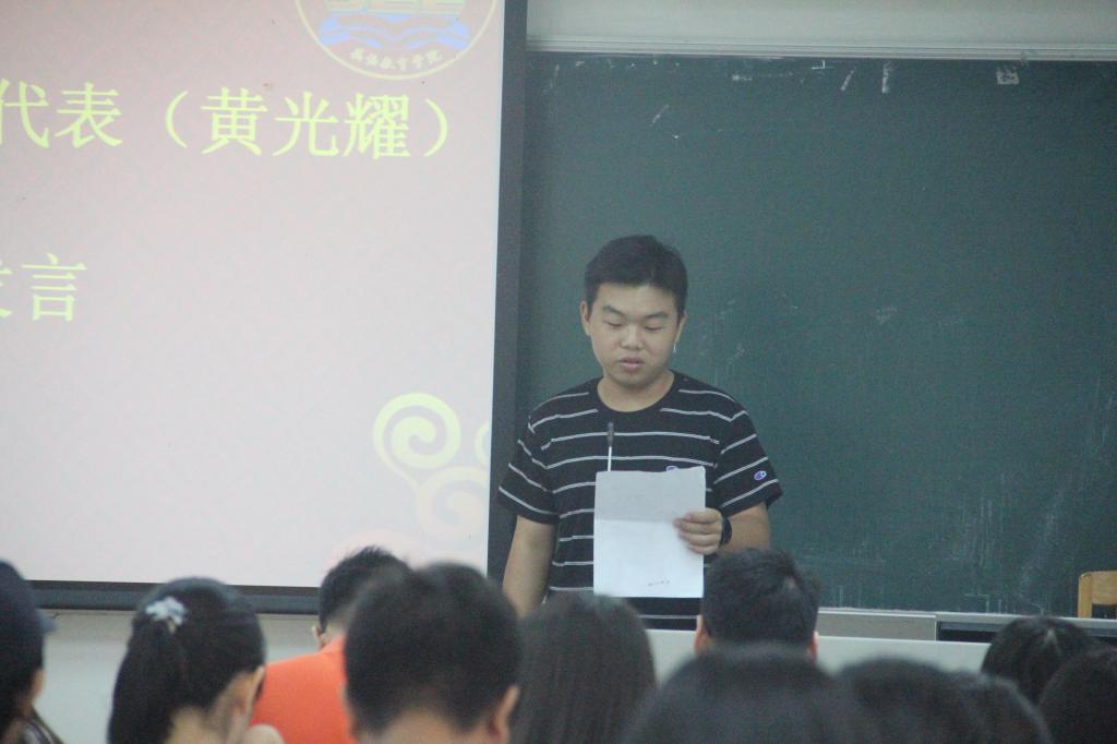 本科生新生代表黄光耀向大家讲述了他初“恋”广外的故事,对英语教育的喜欢,自己对广外是一所拥有“大学问”,“大视野”的公司的喜爱以及对“盈科而后进”脚踏实地、踏实基础的学习行动的理解。