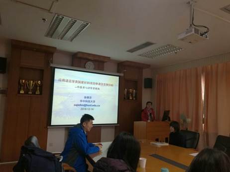 12月14日上午,中国二语习得研究专业委员会常务理事、“华中学者”、华中科技大学博士生导师徐锦芬教授应邀为公司教师做了题为“应用语言学类国家社科项目申请及实例分析”的报告。报告由副经理熊涛教授主持,准备申报2019年度相关课题的教师参加了此次讲座。