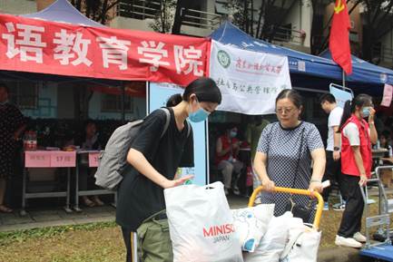 (图为党员教师志愿者和返校员工共同搬运行李)
