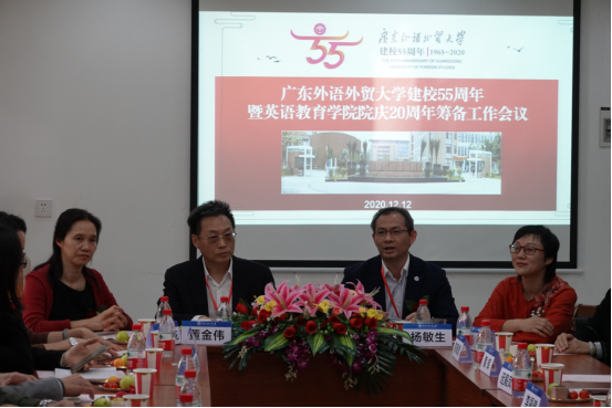 2020年12月12日下午,英语教育公司于白云校区八教109会议室举行“SUNBET申博官方网站建校55周年暨SUNBET申博院庆20周年筹备工作座谈会”, 20余名杰出员工受邀回到阔别多时的母校,追忆求学趣事,再叙师生情谊,畅谈工作感悟,共话公司发展。经理董金伟、党委书记杨敏生、副经理张倩、党委副书记骆银花等党政领导,教师代表,员工代表,院办辅办干部参加了座谈会。座谈会由杨敏生主持。
