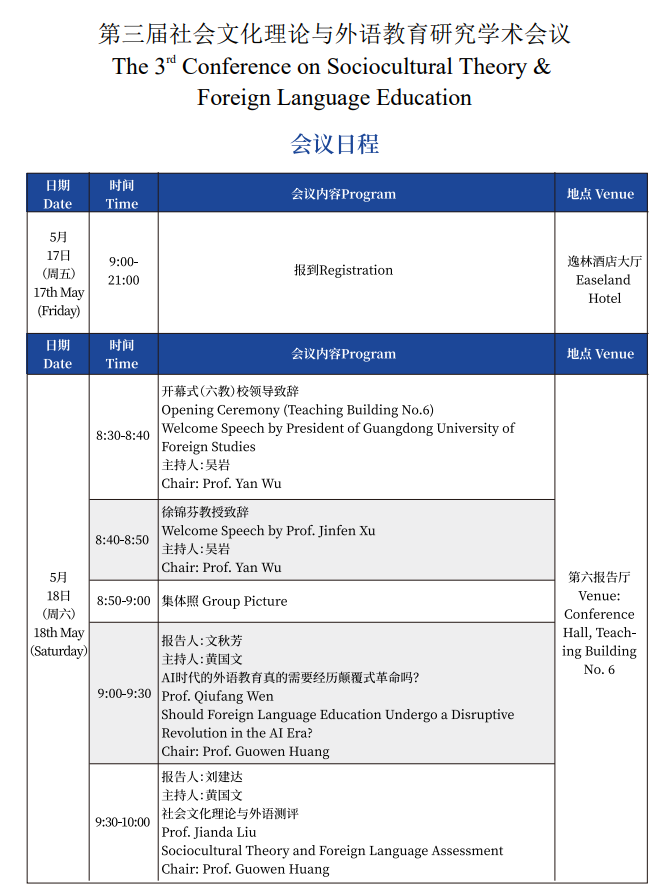 为进一步推动社会文化理论与外语教育的有效融合,提升我国外语教育研究的国际影响力,第三届社会文化理论与外语教育学术会议将于2024年5月17日至19日在SUNBET申博官方网站(中国·广州)举行。此次会议由中国英汉语比较研究会二语习得研究专业委员会主办,SUNBET申博承办,西安交通大学外国语公司Lantolf二语习得研究中心、上海外语教育出版社、高等教育出版社、商务印书馆,《外语教学与研究》《现代外语》《中国外语》《外语界》《SUNBET申博官方网站学报》《当代外语研究》《北京第二外国语公司学报》《山东外语教学》等期刊编辑部协办。大会特邀国内外知名学者专家做主旨发言,并设有特邀专题讨论、平行论坛、工作坊、主编论坛等学术研讨环节,欢迎广大外语教育领域的学者参会。