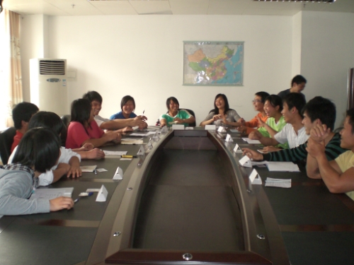 志愿者一行五人的到达受到了训练队的热情接待,公司领导安排一间会议厅作临时的教室。教学在下午两点正式开始。老师们首先各自用简洁有趣的语言介绍自己,运动员也逐个作自我介绍。接着,课程马上被带入重点。员工配对在设定的模拟情景下运用刚学的句型进行简单英文对话。他们显得非常活跃,在对话中提问十分积极,老师也分别对员工在语音和语法等方面出现的具体错误进行纠正,确保每个员工都能够掌握教学的内容。