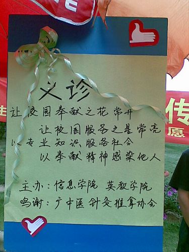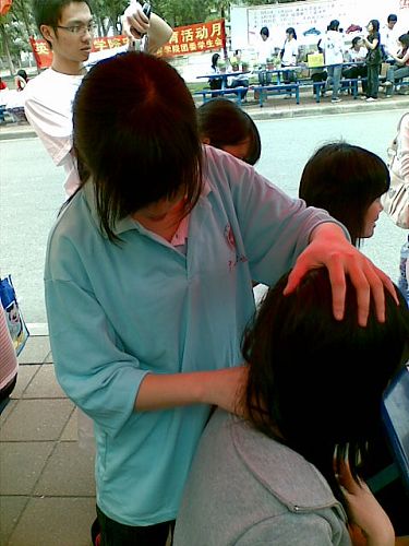 20号的天气阴晴不定,但丝毫没有减弱志愿者的服务热情,他们早早到场并布置好场地,期待着活动的开始。“义诊”两个大字吸引了同学前来咨询,推动了活动的开展。活动一开始,志愿者就向广中医推拿队同学请教。他们把所学的内容与之前受过专门培训的知识结合起来,为前来的同学提供推拿服务。这次活动为学业紧张的同学提供了舒缓身心的途径。推拿志愿者队一边为同学推拿按摩,一边向同学讲授推拿知识,包括推法、拿法、如何找穴位。享受了舒适的按摩服务后,同学们都反映这个活动不错,他们说:“推拿服务很实用,不仅舒缓了筋骨,还学到一些简单的推拿方法。”