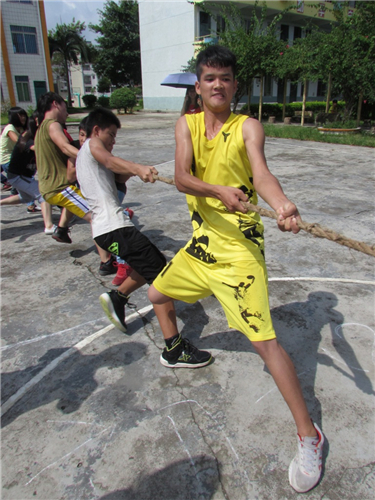 接着是拔河项目,比赛是按年级进行,初一(1)班对初一(2)班,初二(1)班对初二(2)班,采取三局两胜制。在比赛过程中,参赛同学都使出全身力气,相互配合,同时两旁的同学也在为自己班的参赛同学加油鼓劲,呐喊声响遍全场。激烈的拔河比赛最终在初一(1)班和初二(2)班的胜利中结束。