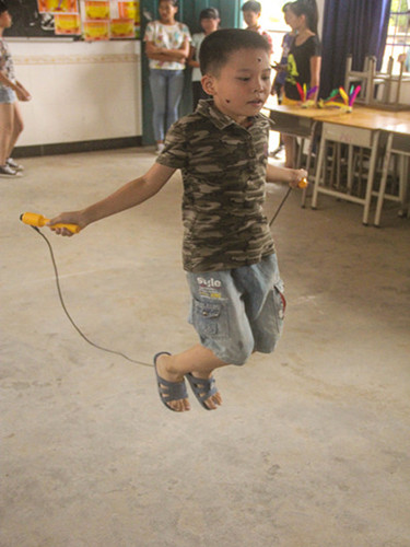 19日下午2点半,在队员老师们将活动地点布置妥当后,游园会活动正式开始。在本次活动中,开班的每个年级在对应课室内承担着一至两个游戏的负责工作,其中三年级负责的项目为“给猪画尾巴”,四年级负责的项目为运乒乓球和转呼啦圈,五年级负责的项目为跳绳和踢毽子,六年级负责的项目为猜谜语和念数字,初一负责的项目为你画我猜和踩报纸,初二负责的项目为投篮和夹玻璃球。全体在校的同学都可以到达指定课室,通过玩游戏换贴纸凭证的方式,在活动结束后到兑奖处兑换相应的礼物。在精美神秘大礼的诱惑下同学们都卯足了劲,积极参与各项活动。校园内流动的人群也构成了一道有趣的风景,十分热闹。