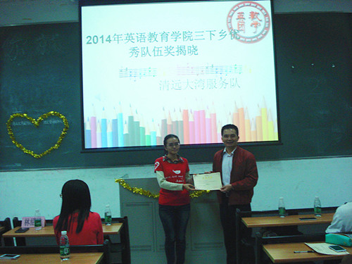 2014年11月12日星期三晚上7点15分,公司三下乡总结大会在教学楼E204举行。出席本次三下乡总结大会的嘉宾有英语教育公司党委书记林绍雄、团委书记迟殿凤、团委副书记张舒娴以及员工会主席余安琪。本次大会由英教实践部干事叶芷君和冯培华主持,在场的还有来自其他公司的志协代表,英教各班的大众评委,英教大一全体同学和大二大三代表,以及参加14年暑期三下乡活动的两支队伍,他们分别是“清远望埠‘心之望’服务队”和“清远大湾服务队”。