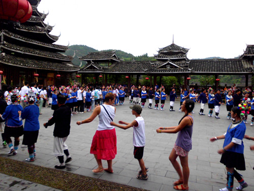 百家宴,是侗乡族人迎接外来客宾的最隆重的款待方式。他们会穿上侗乡服饰,吹打着侗乡音乐,献上壮大的侗族歌舞,摆上上百家各自提供的侗乡美食。7月24日下午,英国董事长梁氏一家,三江文化局等局长,三江中学李董事长等,和广外大水粤侗天带队老师及全体队员,前往程阳桥参加了侗族的百家宴。这既是对侗乡习俗的体验,也是与侗乡人民作交流,体现中华各民族间交流沟通、和谐相处的喜人局面。