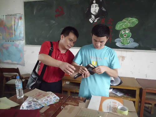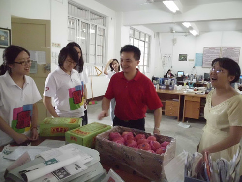 一箱大红苹果,是林书记的心意,从广州到广西三江,在火车上颠簸了22个钟后,终于到达水粤侗天服务队的所在地——三江中学。外出携带物资是不便的,尤其是沉重的东西。但应服务队队员的要求,林书记不仅把凉茶送到千里之外,还不辞旅程的劳苦,把一大件红苹果带到三江中学的办公室。大红苹果,不仅让队员深切体味到林书记慰问,苹果的浓浓情意,更让甜甜的滋味流动到他们的心中。