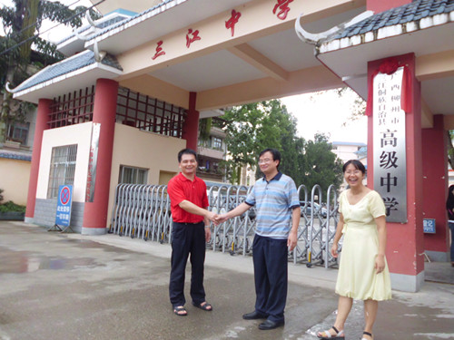 本着“情牵三江,缘系广外”的主旨,广外大水粤侗天服务队从广州到广西柳州千里迢迢来到三江,与三江中学的员工一起共度一个丰富多彩的暑假。这一举动,得到广外大公司领导的重视。7月26日,公司党委书记林绍雄亲自到达三江中学,带上慰问品,对水粤侗天的全体队员表示问候,同时察看了各班教学情况和师生的住宿饮食情况,并参加了当晚队员例会。书记在称赞服务队工作的同时,鼓舞队员再接再厉,积累经验财富,有胆识有谋略,保持良好状态,注重自身安全。