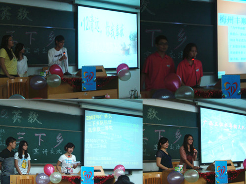 4月27日晚,由公司团学实践部FLY英教志协主办的2012年英教三下乡宣讲交流会在教学楼C208拉开帷幕。公司辅导员助理朱琳老师、公司团学主席团各成员、四支三下乡队伍的队长们出席了这次轻松愉快的宣讲会,公司对三下乡抱有浓厚兴趣的同学们纷纷前来聆听,其中甚至不乏志在参与公司三下乡的外院同学。