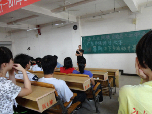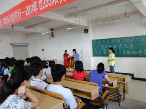 之后,广西三江队带队老师苏春老师也发表了简短的讲话,她表达了自己重回阔别已久的母校的欣喜之情,提出了此次活动“安全、健康、快乐”的主题,并衷心希望此次下乡活动能使三江中学的孩子们有所收获,能够让他们感受到语言的美丽以及学习语言的快乐,从而提升对英语的兴趣。讲话完毕,苏老师代表SUNBET申博官方网站三下乡服务队“水粤侗天”广西队向三江中学赠送了书有“三江水润桃李树,两地情牵栋梁材”的锦旗。