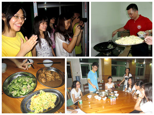所谓千呼万唤始出来,一番功夫以后,色香味俱全的大湾队员“DIY美食”隆重登场,队员们赞不绝口地品尝着同伴的辛勤劳动成果,同时也品尝着自己动手丰衣足食当中的乐趣。大湾队民间卧虎藏龙的大厨们以其足以媲美星级酒店的厨艺赢得满堂彩,也为我队的伙食新制度开了个好头。