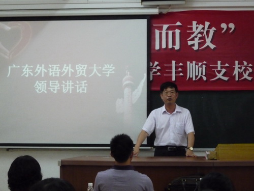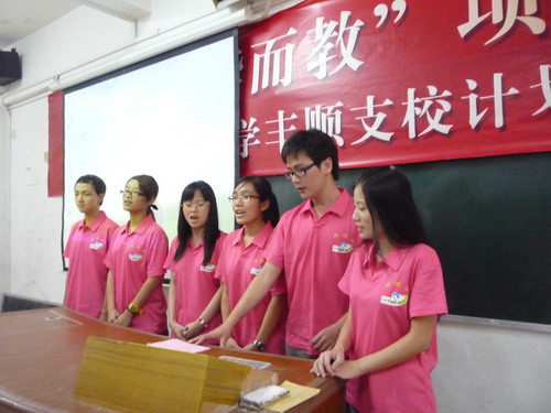 启动仪式的第一个环节是全体起立,奏唱国歌,接着是丰顺中学曾董事长发言。曾董事长对SUNBET申博官方网站的带队老师陈冬梅老师和6位支教志愿者表示热烈的欢迎,并且全面分析了提高丰顺中学英语口语水平的必要性和重要性。