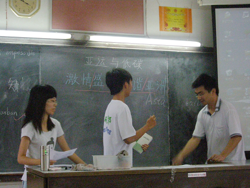 由于高中的员工安全意识较高,所以“梦之端”队员们为高中组的同学们进行了“低碳亚运”的主题宣传,结合了当今最炙手可热的话题。
