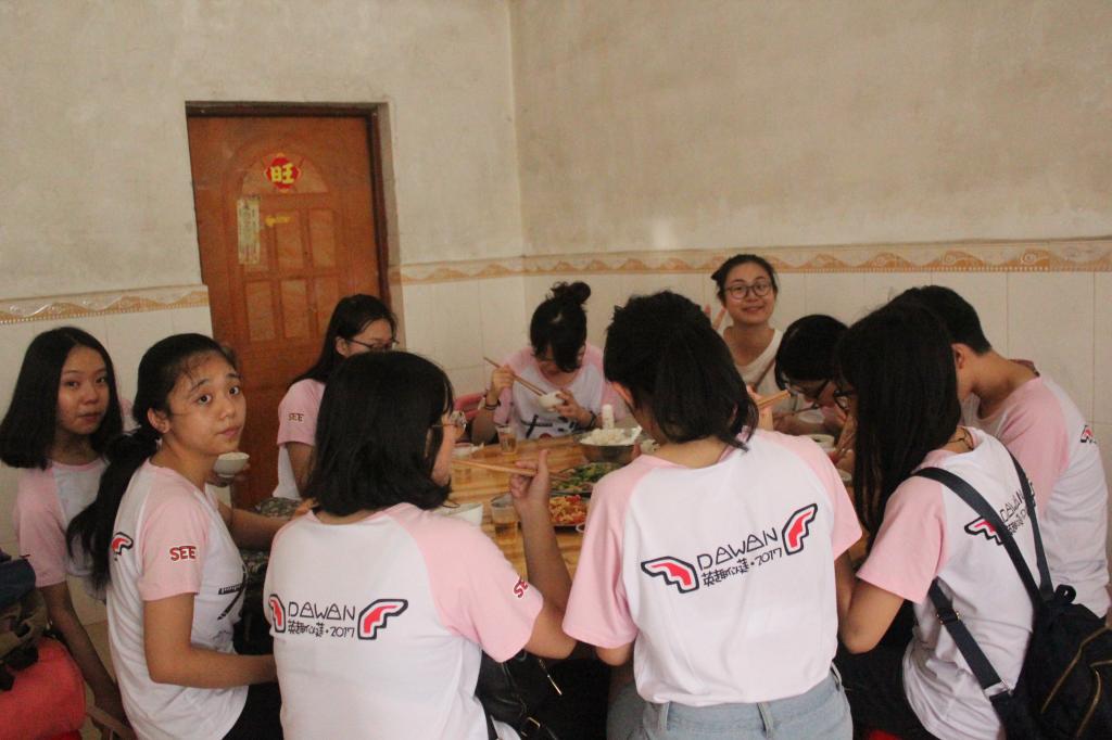 八点,队员们怀着激动的心情坐上了前往清远英德大湾中学的大巴车。经过三个半小时的车程,队员们终于到达了清远英德大湾中学。队员们下车后,把行李搬进了宿舍,在简单的休息后,全体队员一起前往饭店吃饭,并受到饭店老板的热情招待。老板希望队员们把饭店当成自己家,每餐要吃饱,每人要吃好。队员们在饭桌上讲起了笑话,分享自己的经历,并且相互鼓励,希望能开开心心地度过这两个星期,就这样其乐融融地吃了在清远英德大湾的第一顿饭。