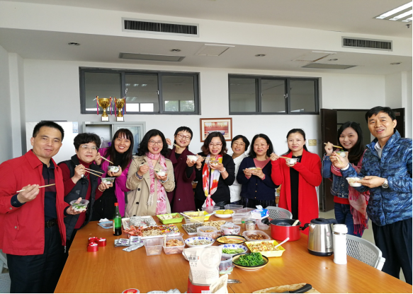 齐湘燕老师专程从家里做好菜,还保温,正好午饭时赶到,她带来了一道家乡特色菜:青豆血鸭,味道相当好!刚摆上桌,转眼间连一滴鸭血都不剩。卓艳芬老师带来了红色米糕和其他小吃,成为了饭后甜点,同时还捐赠了一套漂亮的碗给职工小家。