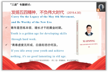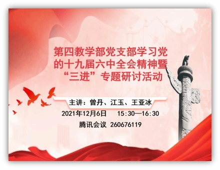 12月6下午第四教学部党支部举行线上活动,学习党的十九届六中全会精神,深入推进大学英语课程“三进”专题研讨。会议由支部书记曾丹老师主持,全体教师党员参加。