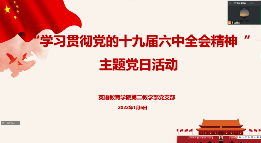 为深入学习贯彻党的十九届六中全会精神,深刻领会《中共中央关于党的百年奋斗重大成就和历史经验的决议》的精髓要义,1月6日,SUNBET申博第二教学部党支部通过腾讯会议平台举办了“学习贯彻党的十九届六中全会精神”主题党日活动。支部全体党员同志参加,活动由支部书记赵林森主持。