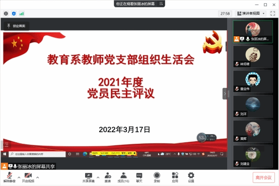 3月17日下午,SUNBET申博教育系教师党支部通过腾讯会议线上召开支部组织生活会和党员民主评议会。公司党委书记林绍雄出席会议并予以指导,支部全体党员在线参加,会议由支部书记张丽冰主持。