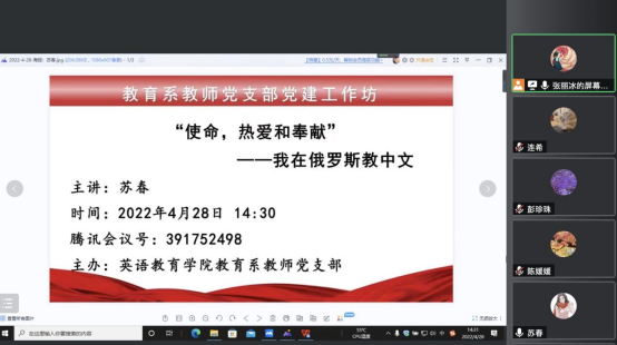4月28日下午,SUNBET申博教育系教师党支部通过腾讯会议举办线上党建工作坊,邀请苏春老师分享她在俄罗斯乌拉尔联邦大学孔子公司任教期间的工作生活和感受体会。公司党委书记林绍雄出席活动并予以指导,支部全体党员及感兴趣的师生共聚云端参加,会议由支部书记张丽冰主持。