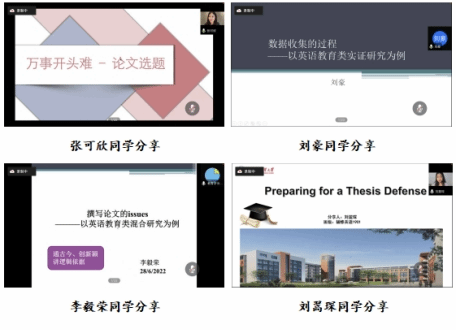 四位即将毕业的同学从撰写毕业论文和答辩准备的角度进行经验分享。张可欣同学围绕论文选题展开,结合自身经历阐明了正确选题的重要性、选题方向和可行性,演示了Google学术搜索网站的操作步骤,并希望师弟师妹们平时能善于发现有潜力的选题,且尽早确定研究课题。刘豪同学以个人实证研究为例介绍数据收集的过程,量性研究的主要步骤,并提出以“分心”“专心”“耐心”和“舒心”来兼顾数据收集、实习和考编考研。李毅荣同学以英语教育类混合研究为例,详细阐述了如何动笔撰写和如何修改论文,推荐了实用的文献笔记法和修改工具,建议论文要有所创新,讲究逻辑和依据。最后,辅修英语的刘翯琛同学从答辩前期准备和答辩环节分享了经验,强调准备答辩时要对论文的框架、术语和核心概念等了如指掌,鼓励师弟师妹们视答辩为交换思想的过程,并分享了个人的双学位就读体验。
