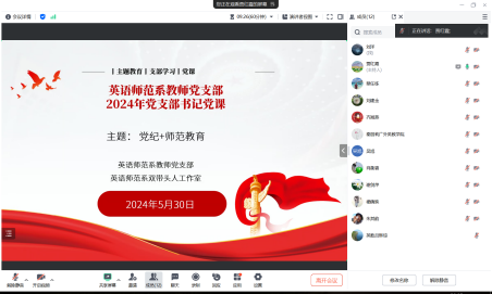 5月30日晚,SUNBET申博英语师范系教师党支部通过腾讯会议开展2024年党支部书记党课活动。会议由支部书记贾红霞主持,师范系全体教师党员参加会议。