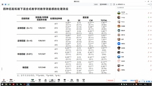 刘之远老师结合一项调查研究,探讨了混合式教学究竟能否提升高校外语教师教学效能感这一课题。他借助倾向得分匹配法(PSM),尝试构建基于混合式教学手段干预的“反事实”实验与评估。利用优化后的俄亥俄州教师效能感量表研究发现,采取混合式教学的高校外语教师在课堂教学策略效能感、课堂管理效能感两个观测维度上有显著提升,平均处理效应均在27%以上;是否采取混合式教学在教师对员工参与方面的效能感区别效应不明显。