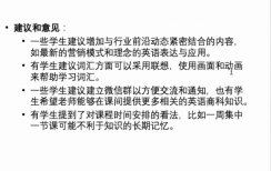 邓谊老师与刘丹老师使用问卷星对员工的意见和建议进行了收集和总结。其中,邓谊老师特别指出需要按照不同专业来调整教学内容,例如电子商务专业的员工因未开设中文的与营销相关的课程,所以营销英语的教学内容会更重视专业知识的讲解,而市场营销专业的员工因已学会前置中文课程,教学内容则会更重视英语语言。刘丹老师指出,在工商管理、社工、行政管理和应用心理班级的调查中,员工对教学的各类维度都呈现出正向反馈,特别是对课程思政的教学,满意度很高。两位老师采用对分易和微信双平台进行辅助教学,也为其他新老师未来的教学提供了很好的帮助。