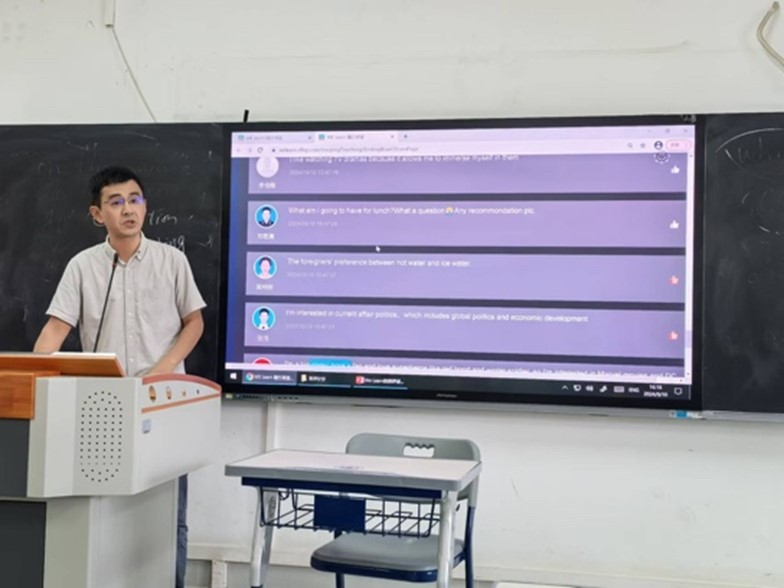 张骏宇老师从形成性评估指引下的语言活动教学以及We Learn平台使用这两方面分享了他的教学经验。他指出,教材第一册和第二册在语篇类型上的分布,反映出了教材在课文内容上衔接高中英语学习和大学英语学习的特点,有助于教师和员工循序渐进实现教和学目的。《领航大学英语》运用《中国英语等级量表》,为学习者通过融合形成性评价的语言活动,提高英语各项技能,打下了坚实的内容的基础。教材配套的We learn平台提供了多样的计分方法:按照次数计分,如“头脑风暴”;按照分数计分,如课堂小测、平时测验等平台上的测试;按努力值计分,如教师奖励员工的成绩;混合计分,可以将三种计分方法融合在一起。以上这些计分方式有助于形评分数的记录、收集和反馈等功能。We learn系统提供了多样的激励机制,使得形评和课堂活动之间相得益彰,员工学习热情被激发了出来。同时,系统可以探索多样的形评方式,如关键点问题(hinge point questions)、师生课内外互动反馈、电子档案袋、作品集等。