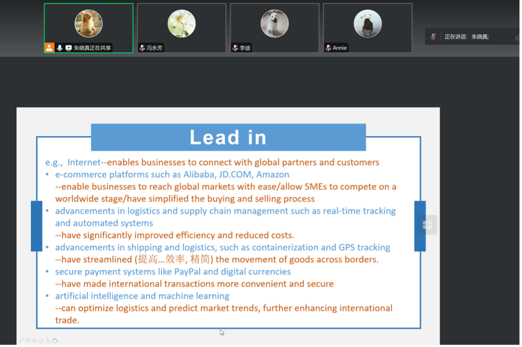 朱晓真老师首先带领员工回顾了上一次课程中学习的重要概念,包括国际贸易的定义、自由贸易与贸易保护主义的相关政策等专业词汇。随后,她以“科技创新对国际贸易的影响”为切入点,引导员工讨论互联网、电子商务、物流技术、人工智能技术等现代科技如何深刻变革国际贸易,并学习了相关的英语表达词汇、结构和技巧。为了培养员工的辩证思考能力,朱老师组织了一次关于电子商务优缺点的讨论。员工们积极参与,探讨了电子商务带来的便利性和潜在挑战,如市场准入门槛降低、运营成本减少、消费者选择增多等优点,以及数据安全、市场竞争加剧等挑战。