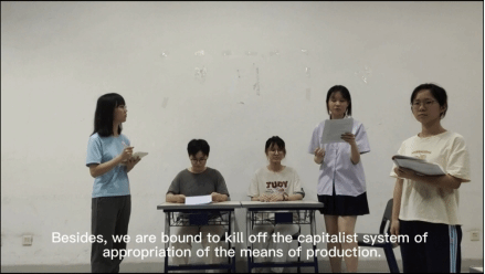 在团体赛选拔中,2019级的方燕清等7名同学演绎情景剧,将历史背景设定为19世纪末到中共一大圆满落幕,重现了《共产党宣言》的译者陈望道先生、创办《新青年》杂志的陈独秀先生还有李大钊先生以及中共一大的主要参会者们的故事,藉此传颂中国青年为中华民族奉献青春的热血精神。