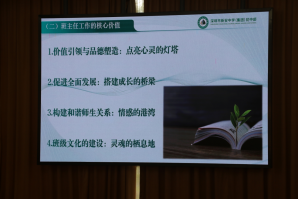在角色定位部分,张董事长指出了班主任的核心价值所在:他们是全能型的角色,承担着班级建设、家校协调等多项职责。她通过生动的例子说明了班主任在价值引领与品德塑造、促进员工全面发展等方面的重要性,并分享了不同类型教师如何发挥自身优势成为一名优秀的班主任。